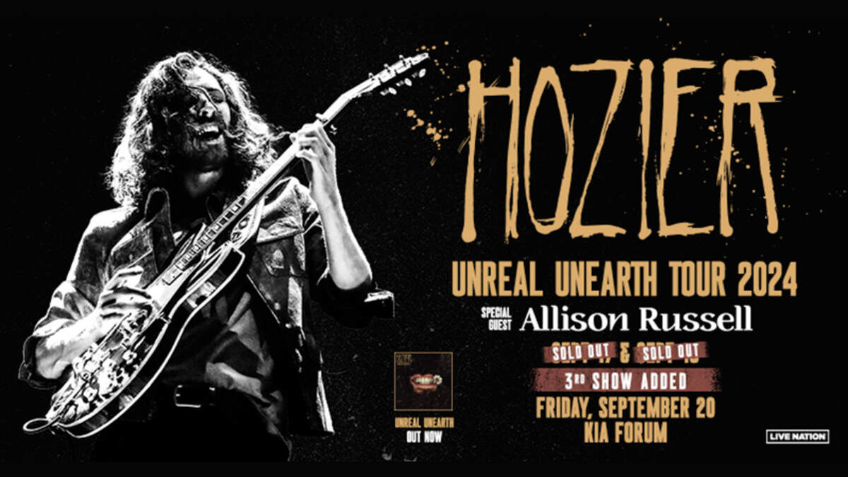 Hozier: Unreal Unearth Tour 2024 hits Kia Forum Friday, September 20th! Tickets go on sale Friday, February 2nd at 12p at ticketmaster.com.